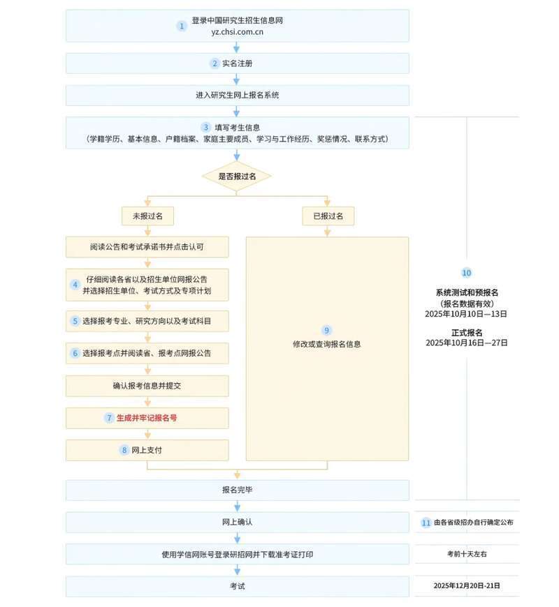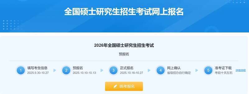 据了解,全国硕士研究生招生考试报名包括网上报名和网上确认两个阶段。其中,网上报名时间为2025年10月16日至10月27日(预报名时间为2025年10月10日至10月13日),每日9:00~22:00。