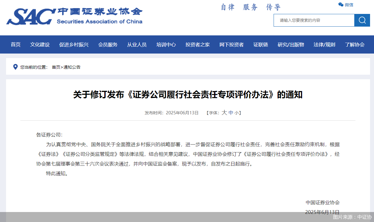 北京商报讯(记者 李海媛)6月13日,中证协修订发布《证券公司履行社会责任专项评价办法》(以下简称《评价办法》),自发布之日起施行。修订后的《评价办法》共十八条,包括总则、评价内容、评价实施与结果运用、附则等四章内容,服务乡村振兴、服务区域协调发展、参与社会公益、所获表彰奖励等四项评价内容,共计13个评价指标。