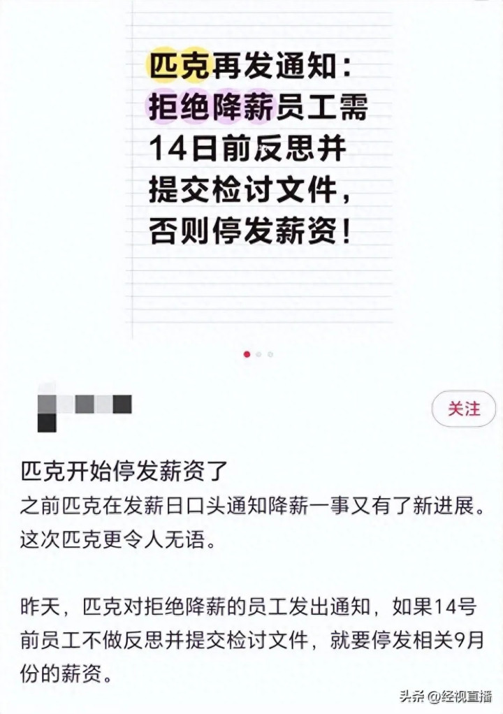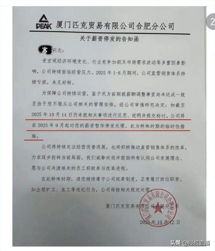 经视直播记者看到,网友展示了几份盖有厦门匹克贸易有限公司公章的文件,其中写道:“鉴于双方前期就薪资调整事项尚未达成一致,且由于你不服从公司相关的管理安排。经公司审核研究决定:如截至2025年10月14日仍未就相关事项进行反思说明并提交检讨,公司将自2025年9月起,对您的薪资暂作停发处理。”