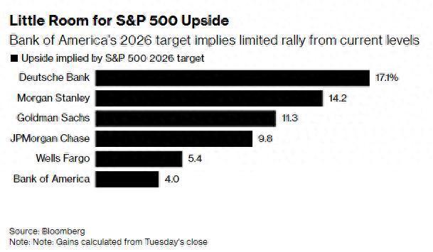 该行预测,标普500指数将于明年12月底收于7100点左右,较周三收盘价上涨约4%。该指数在2025年迄今已上涨约16%,而此前两年涨幅均超过23%。